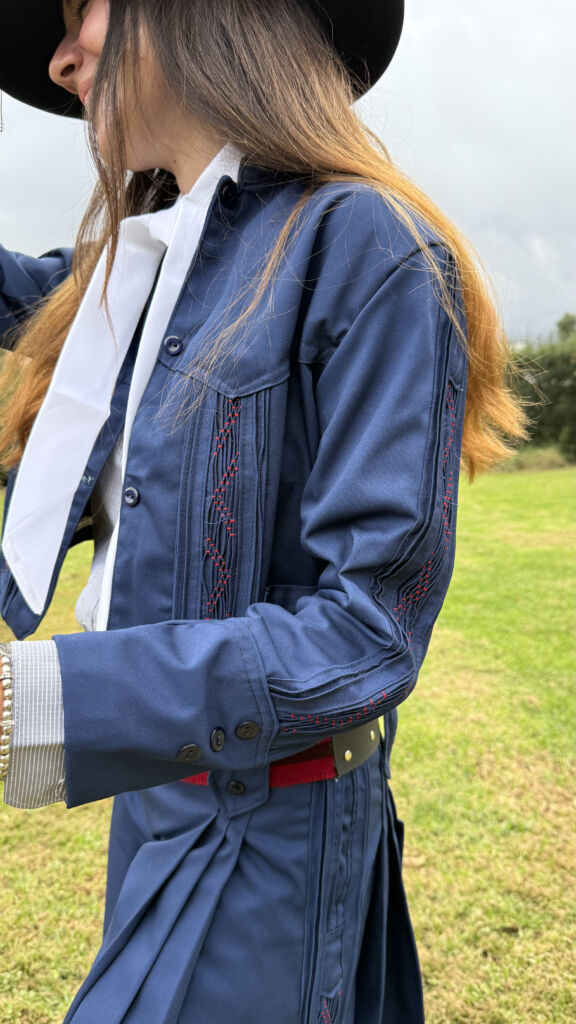 Confeccionado artesanalmente en gabardina alpacuna con nido de abeja bordado a mano, totalmente artesanal